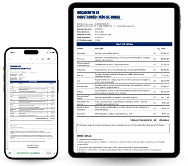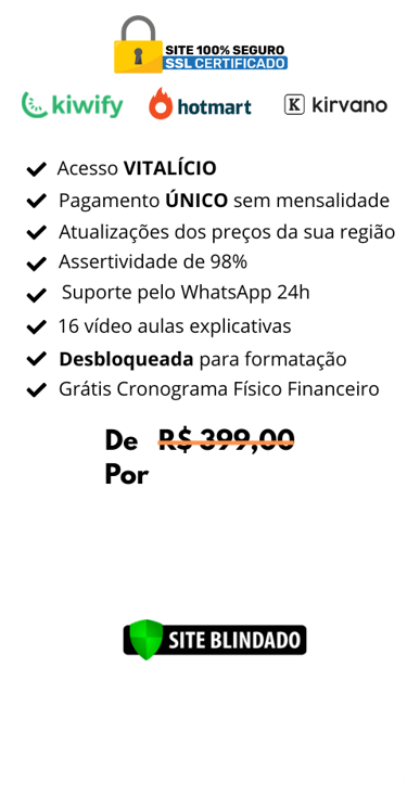 Calcule o BDI, Lista de Materiais, Margem de Lucro, Orçamento com e sem material, Contrato (com ZERO digitação), Cronograma de Obra, Controle de Custos, Dashboard e Calculadora de Tijolos, massa, pisos e revestimentos, laje e pintura.