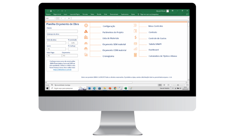 Calcule o BDI, Lista de Materiais, Margem de Lucro, Orçamento com e sem material, Contrato, Cronograma de Obra, Controle de Custos, Dashboard e Calculadora de Tijolos, massa, pisos e revestimentos, laje e pintura.
